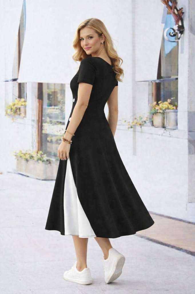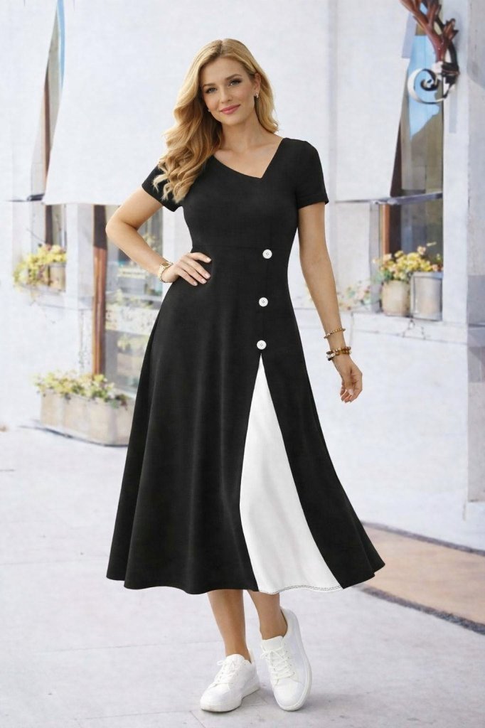 Viskon Kadın Zarif Duruş Kısa Kollu Asimetrik Yakalı Düğme Detaylı Midi Elbise