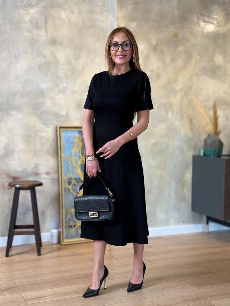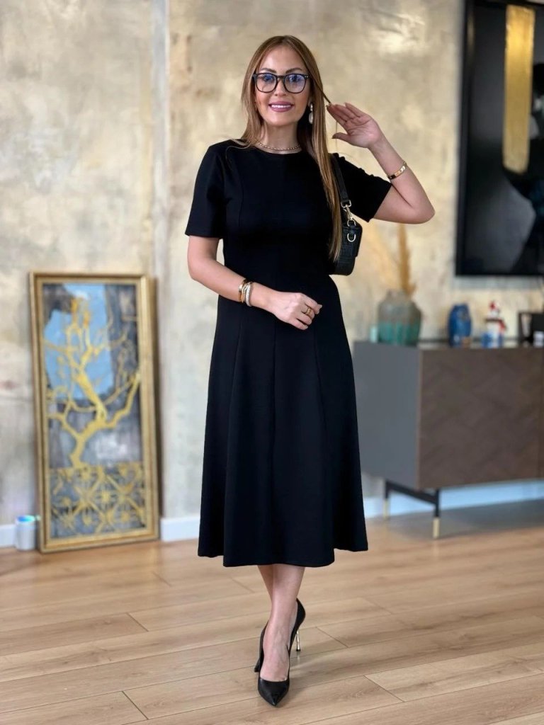 Viskon Kadın Zarif Duruş Kısa Kollu Bisiklet Yaka Midi İki İplik Elbise