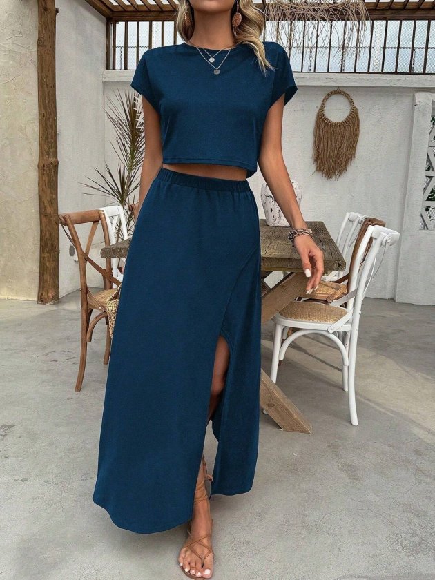 Kadın Kısa Kollu Bisiklet Yaka Viskon Krop Bluz Ve Uzun Etek Ikili Takım