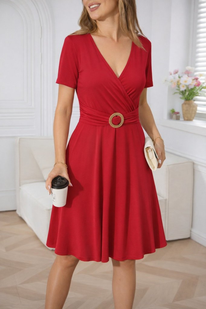 Kadın Kısa Kollu Kruvaze Yakalı önden Toka Detaylı Kısa Viskon Elbise