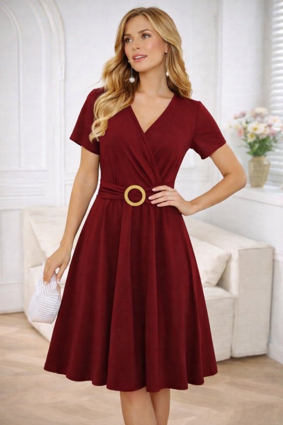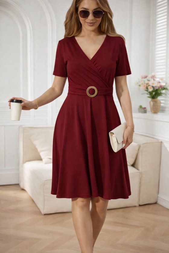 Kadın Kısa Kollu Kruvaze Yakalı önden Toka Detaylı Kısa Viskon Elbise