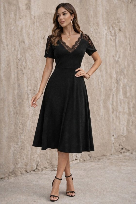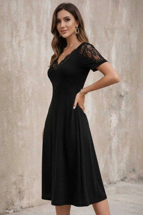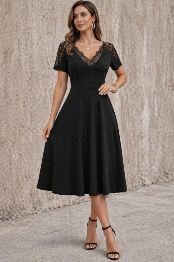 Kadın Kısa Kollu V Dantel Yakalı Midi Viskon Elbise