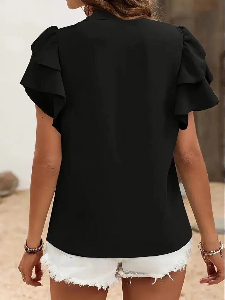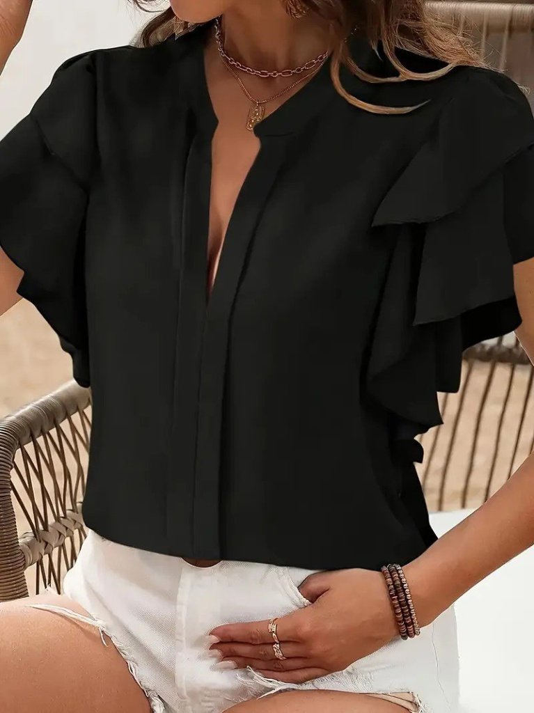 Kadın Kısa Kollu V Hakim Yaka Kolları Fırfırlı Dubai Bluz
