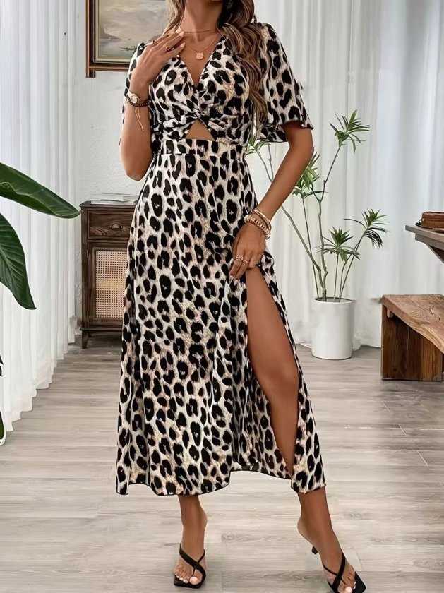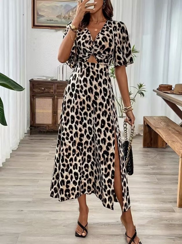 Kadın Kısa Kollu V Yakalı Beli Lastikli Yırtmaçlı Uzun Leopar Desenli Süprem Elbise