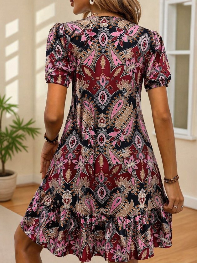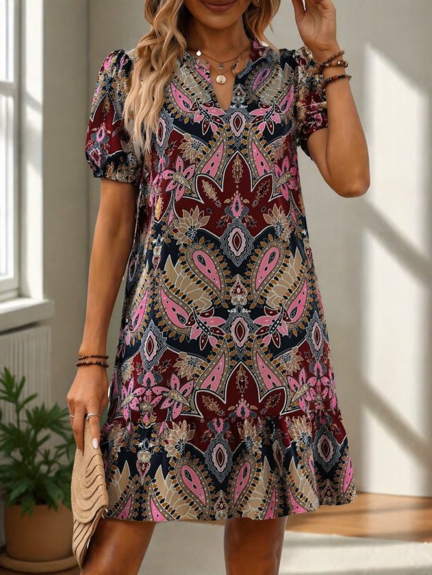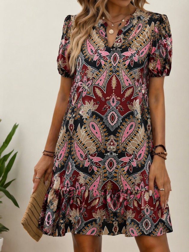 Kadın Kısa Kollu V Yakalı Desenli Kısa Süprem Elbise