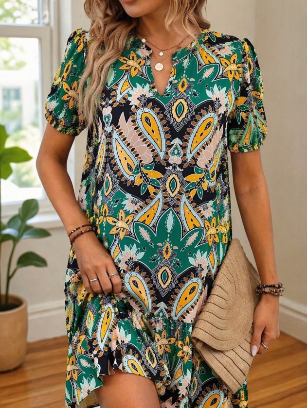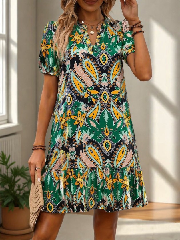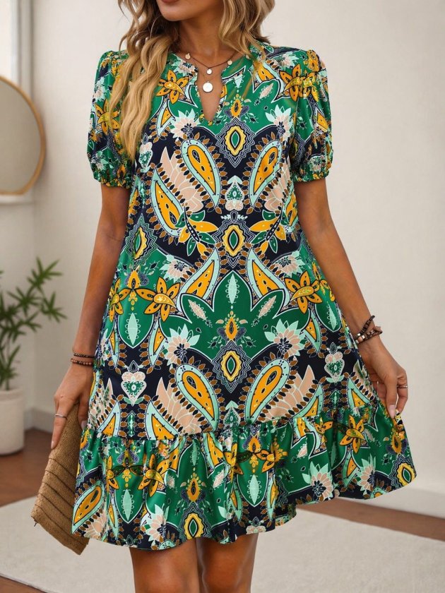 Kadın Kısa Kollu V Yakalı Desenli Kısa Süprem Elbise