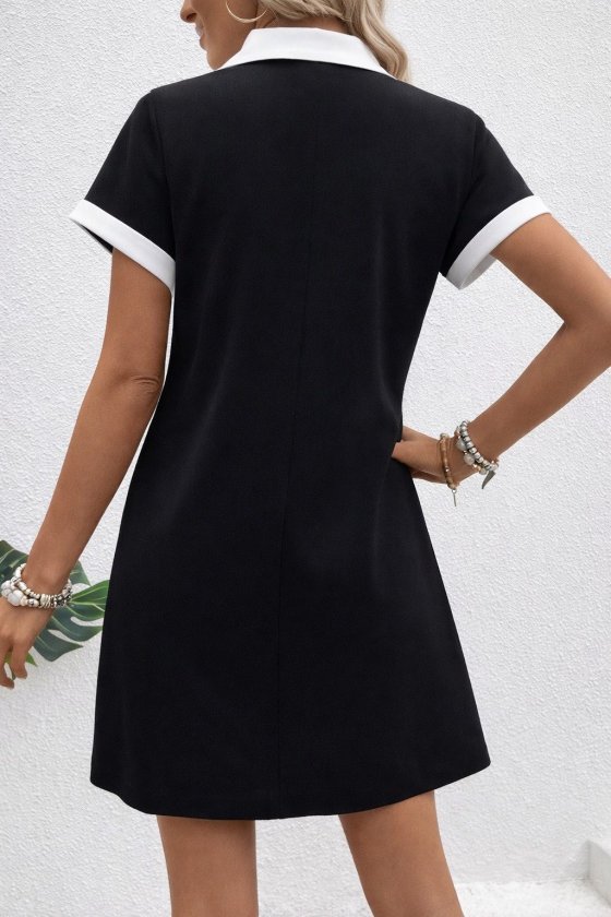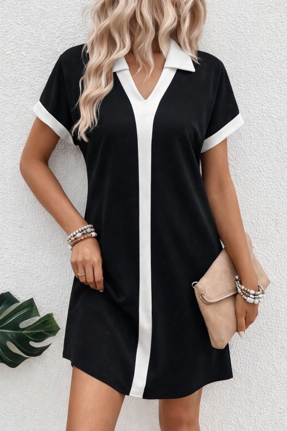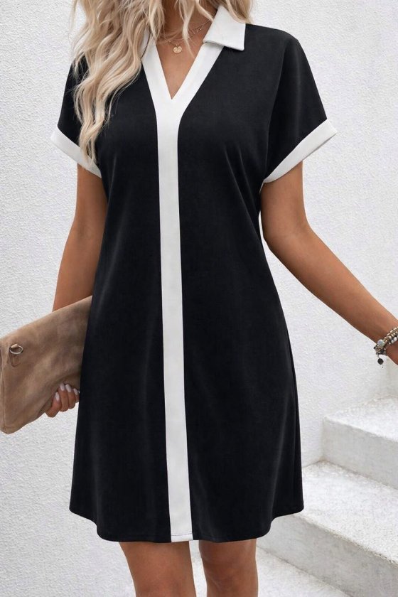Kadın Kısa Kollu V Yakalı Onden şerit Detaylı Yakalı Kısa Janjan Krep Elbise
