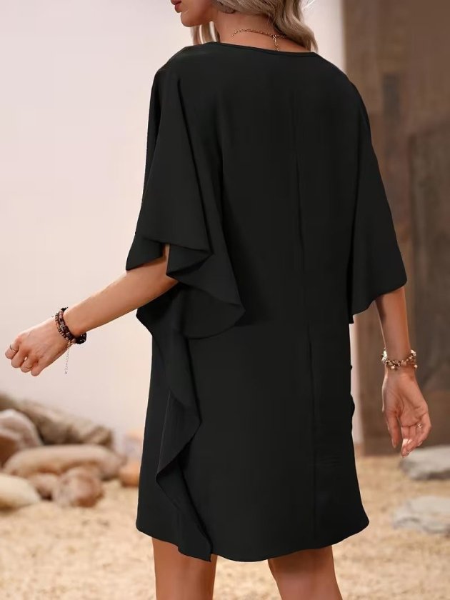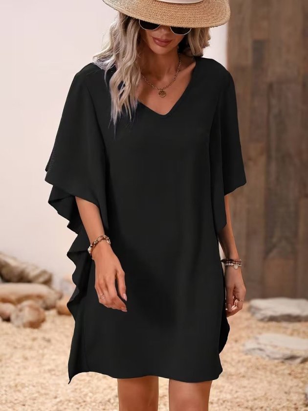 Kadın Kısa Kollu V Yakalı Yanları Volanlı Kısa Ithal Krep Elbise
