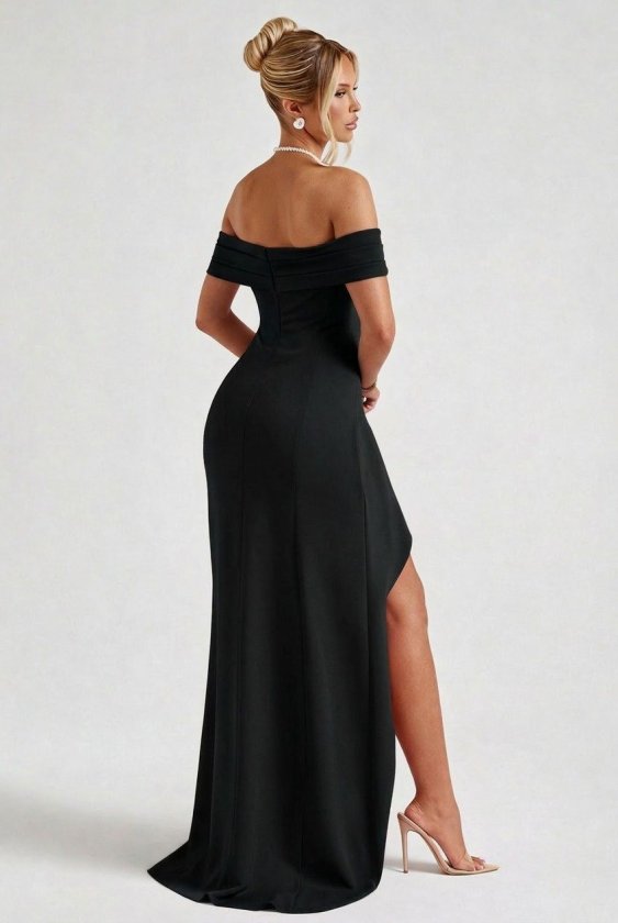 Kadın Madonna Yaka Pileli Derin Yırtmaçlı Uzun Ithal Krep Elbise