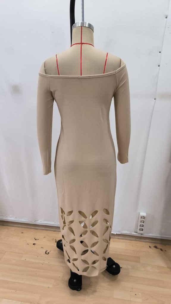 Kadın Madonna Yaka Uzun Kollu Lazer çiçek Kesim Detaylı Uzun Ithal Krep Elbise
