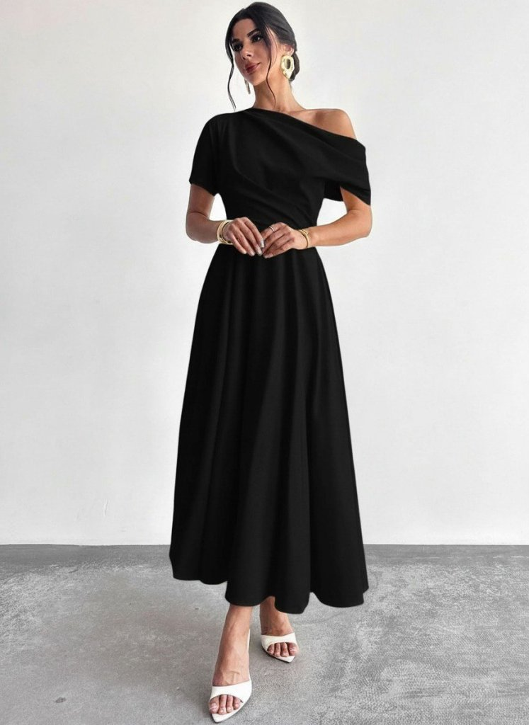 Kadın Omuzdan Açık Kısa Kollu Omuzdan Pileli Uzun Janjan Krep Elbise