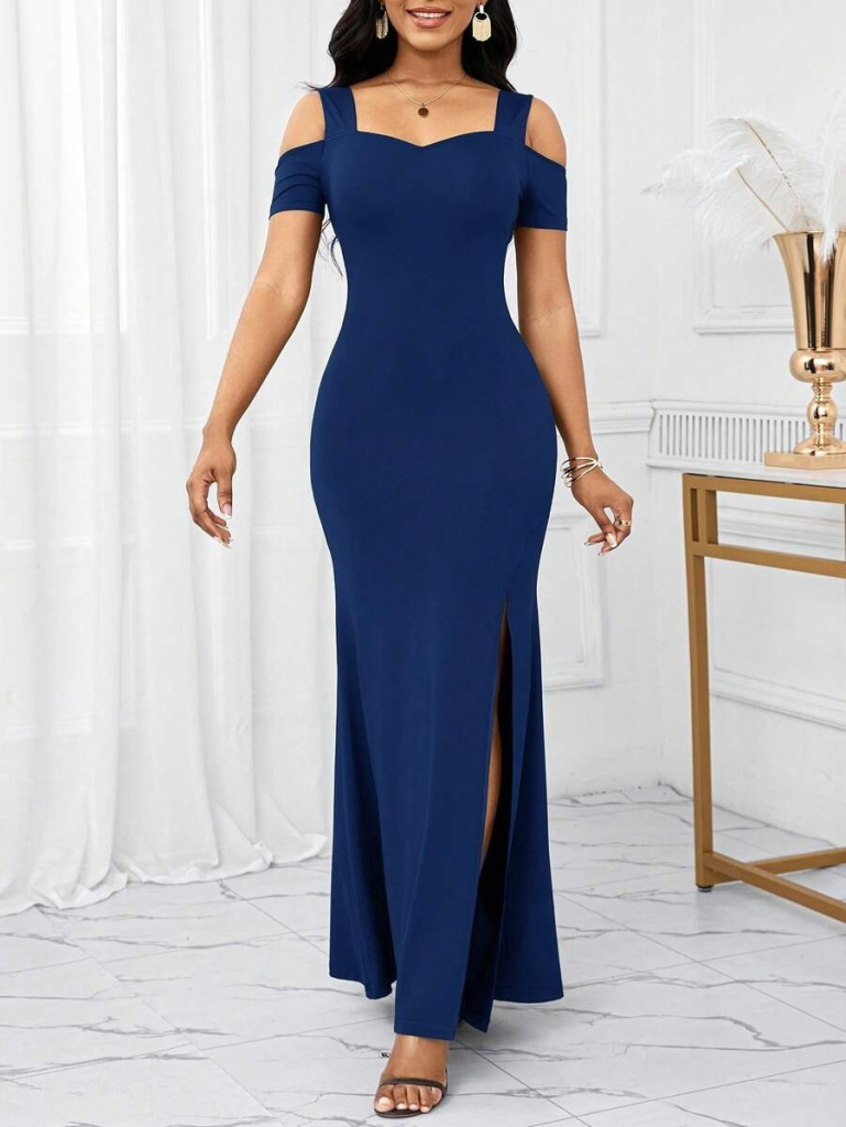 İthal Krep Kadın Zarif Duruş Omuzlardan Açık Askılı Yırtmaç Detaylı Uzun Elbise