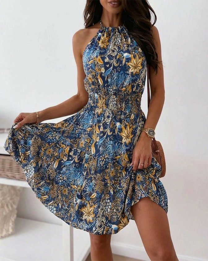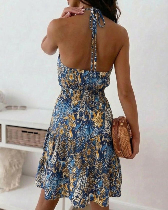 Kadın Omuzlardan Açık Beli Lastikli Desenli Kısa Süprem Elbise