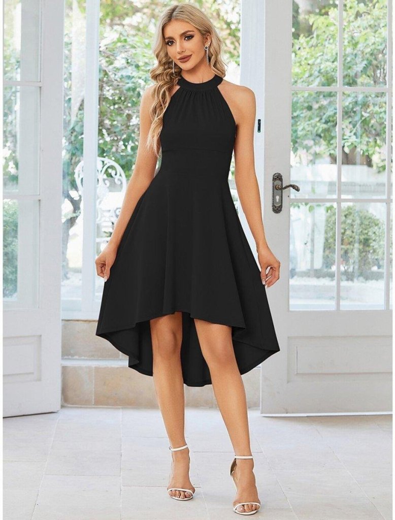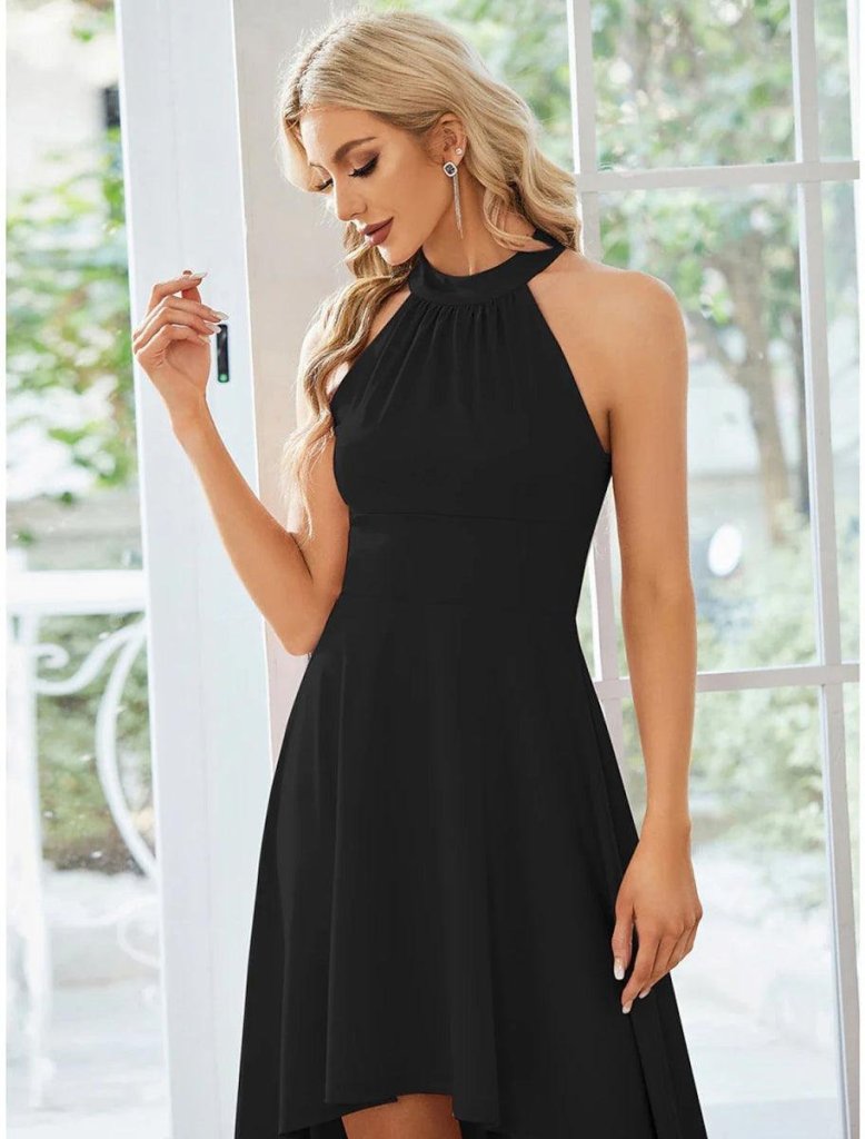 İthal Krep Kadın Zarif Duruş Omuzlardan Açık Boyundan Halka Detaylı Görünümlü Asimetrik Detaylı Kısa Elbise