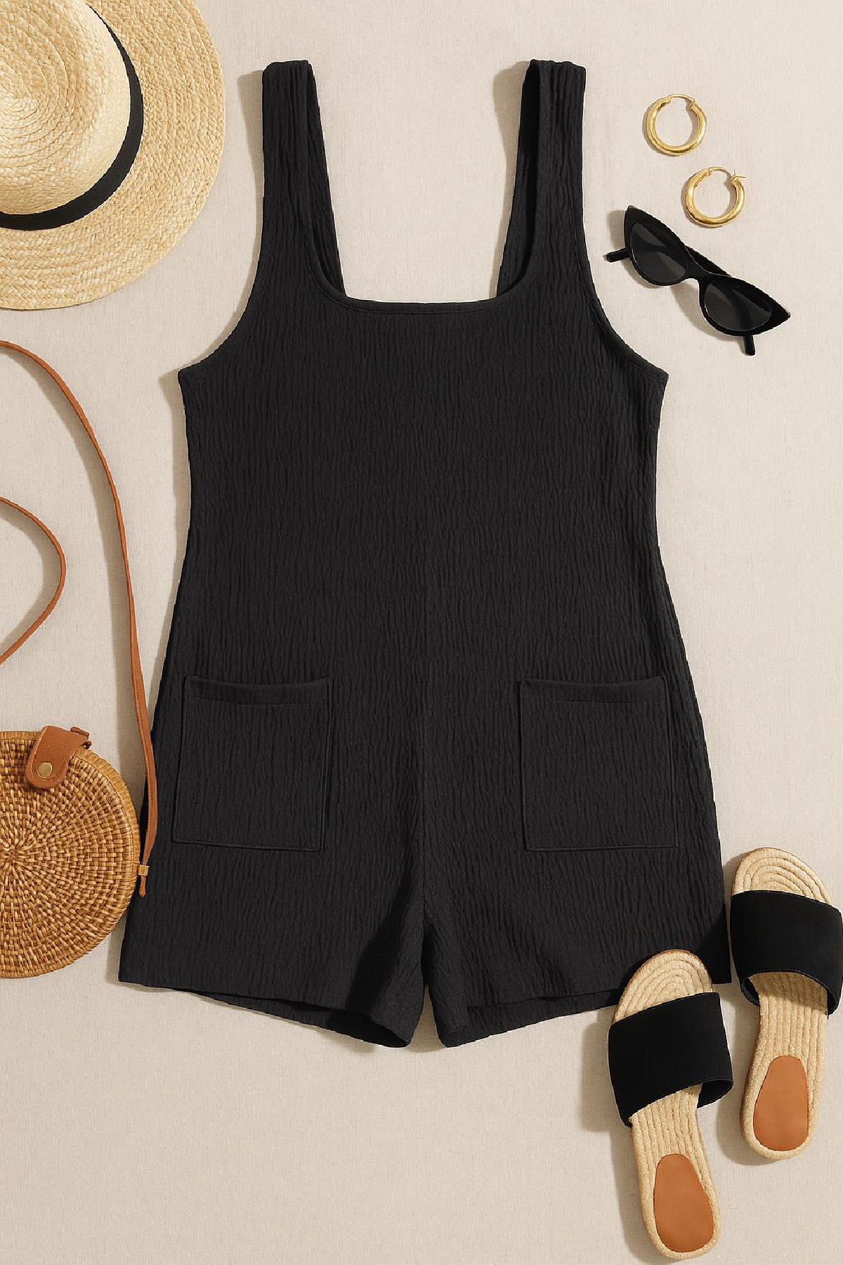 Kadın Siyah Mini Cepli Tulum Plaj Elbisesi yaz aylarının enerjisini yansıtan, şık ve konforlu bir parçadır. Modern tasarımıyla hem günlük giyimde hem de tatil kombinlerinde öne çıkan bu kadın siyah mini tulum, zarif detayları sayesinde rahatlığınızı şıklıkla birleştirir. Hafif ve nefes alabilen kumaşı, özellikle sıcak havalarda konfor sunarken; mini boyu ve siyah renginin asaleti ile her ortama uyum sağlar.