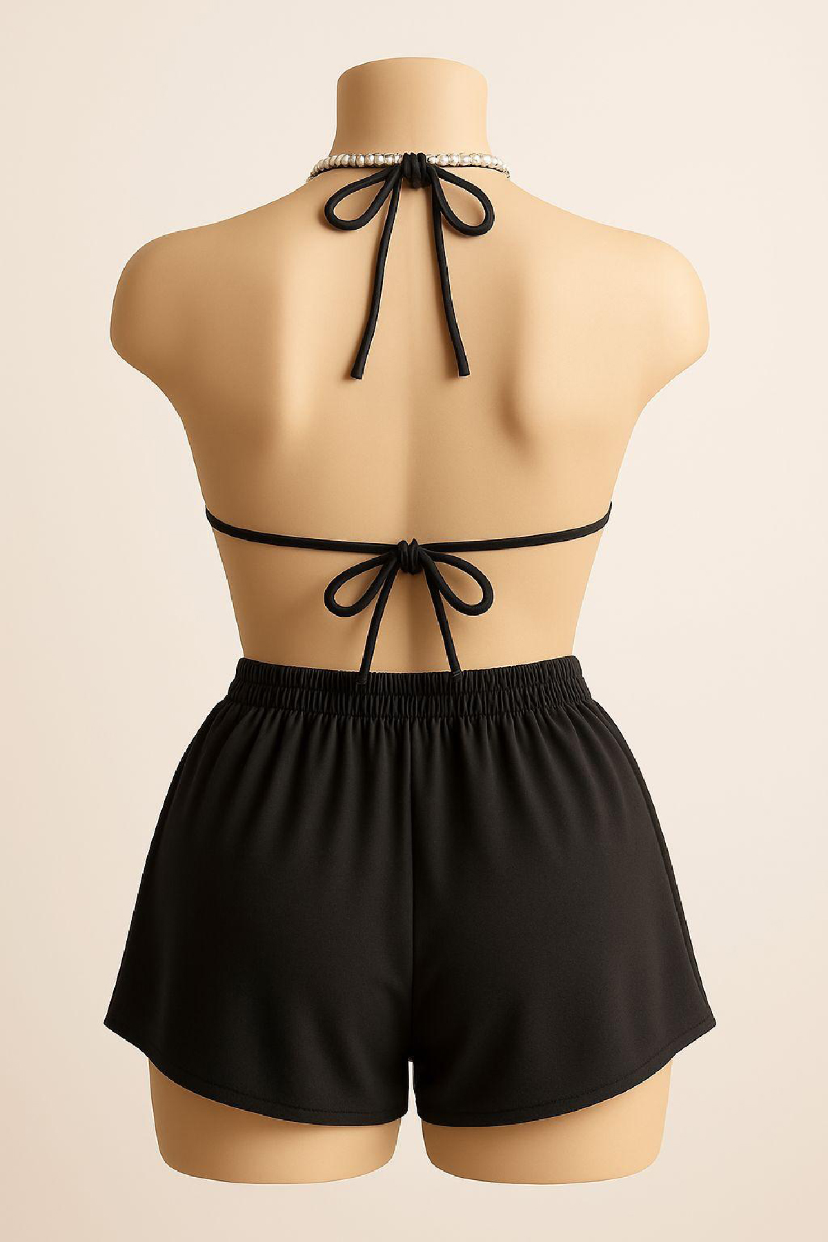 Kadın Siyah Şortlu Belden ve Boyundan Bağlamalı Bikini Takımı