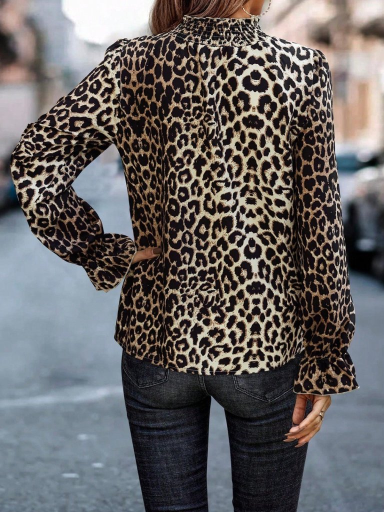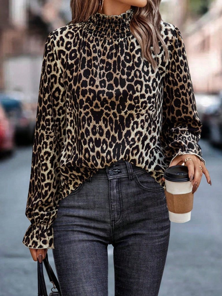 Kadın Uzun Kollu Gipe Detaylı Balıkçı Yaka Leopar Desenli Süprem Bluz