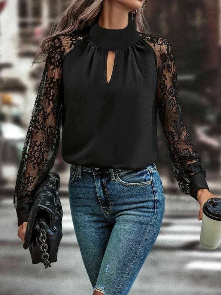 Sandy Kadın Zarif Dokunuş Uzun Kollu Göğüs Pencere Detay Yaka Boğazlı Kolları Tüllü Bluz