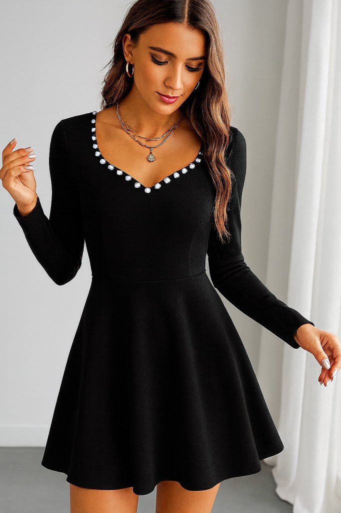 İthal Krep Kadın Zarif Duruş Uzun Kollu Inci Yakalı Kısa Elbise