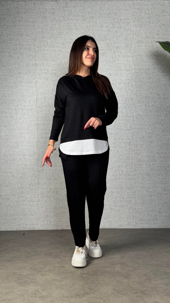 Viskon Kadın Sokak Stili Uzun Kollu Kapüşonlu Bağcıklı İki İplik Bluz Ve Pantolon İkili Takım