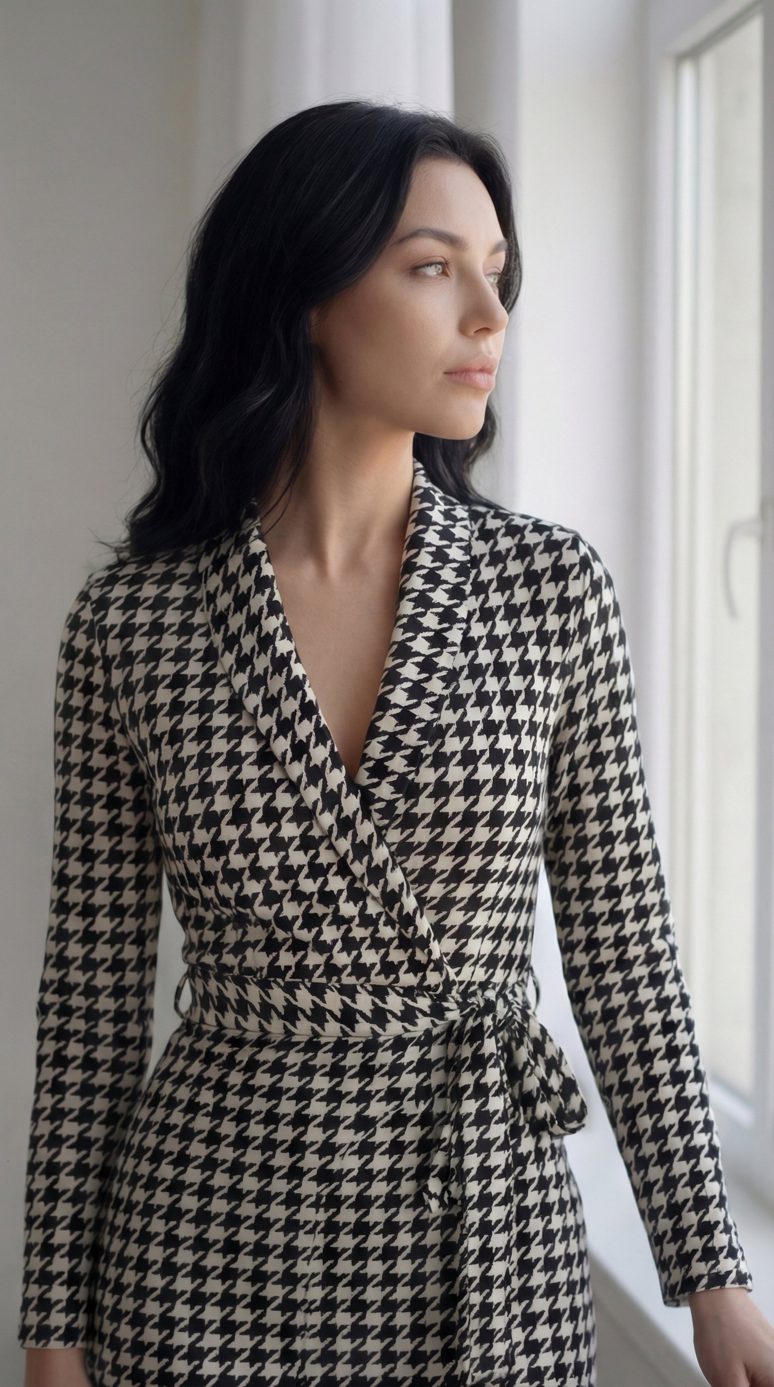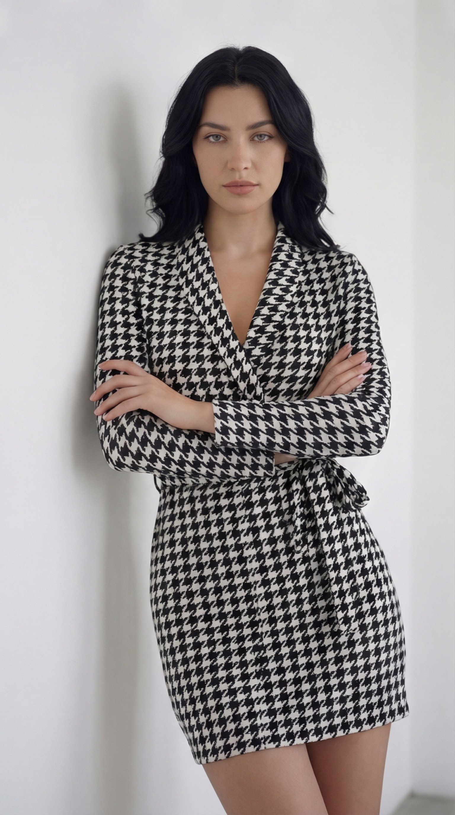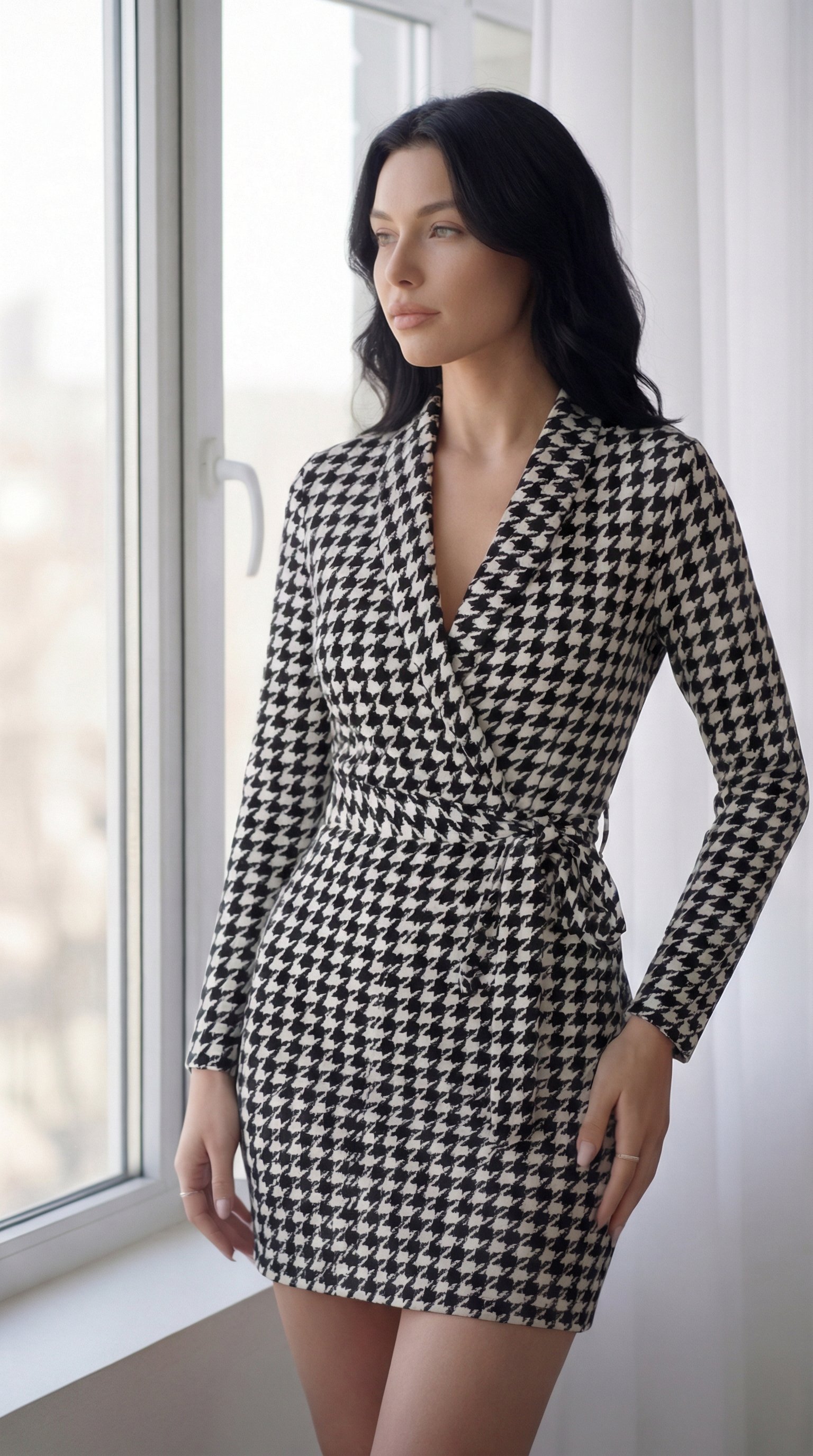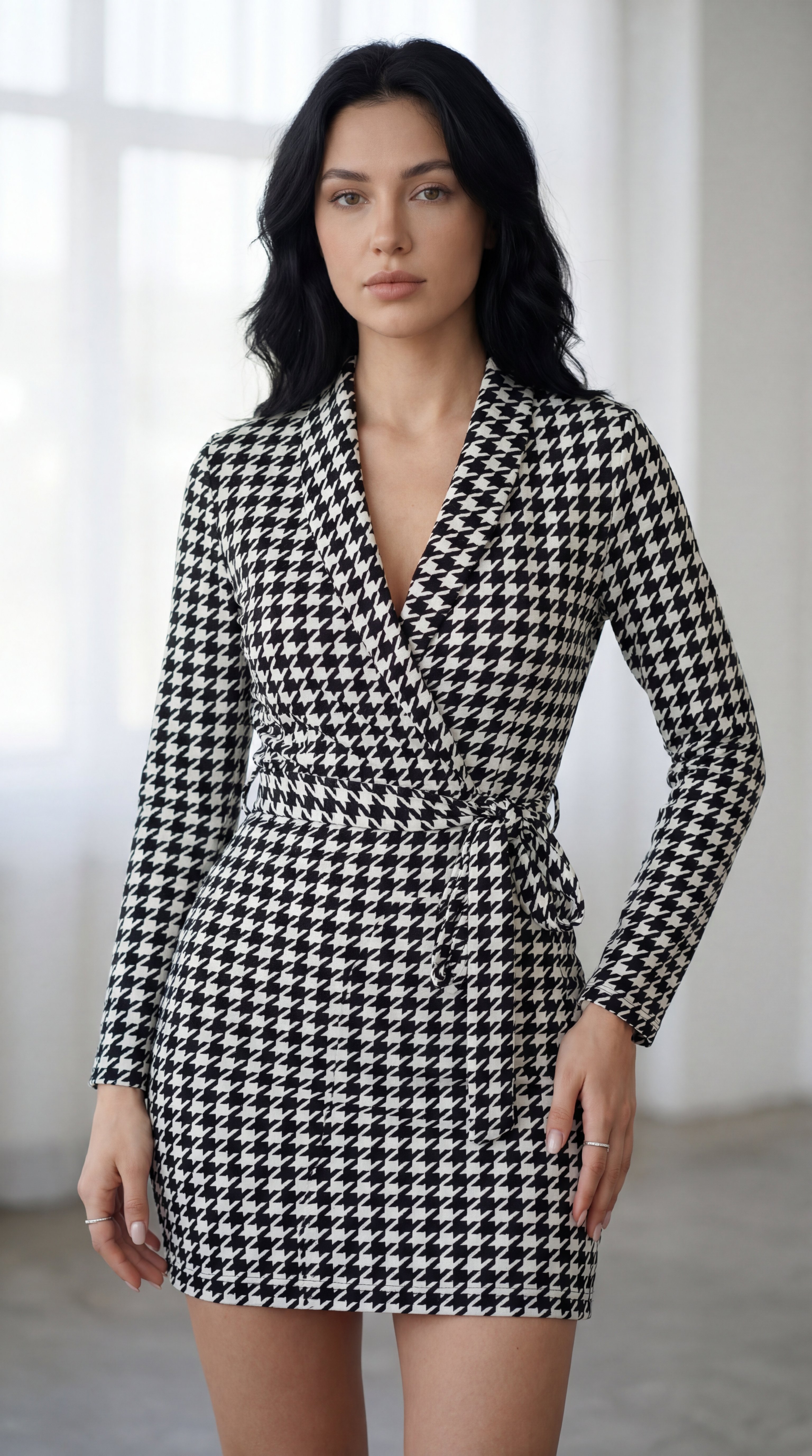 Dalgıç Kadın Zarif Duruş Uzun Kollu Kruvaze Yaka Bağlamalı Kemer Mini Boy Elbise