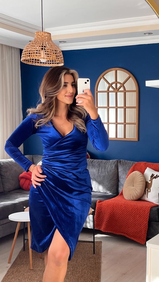 Kadife Kadın Zarif Duruş Uzun Kollu Kruvaze Yaka Belden Büzgü Detay Midi Elbise