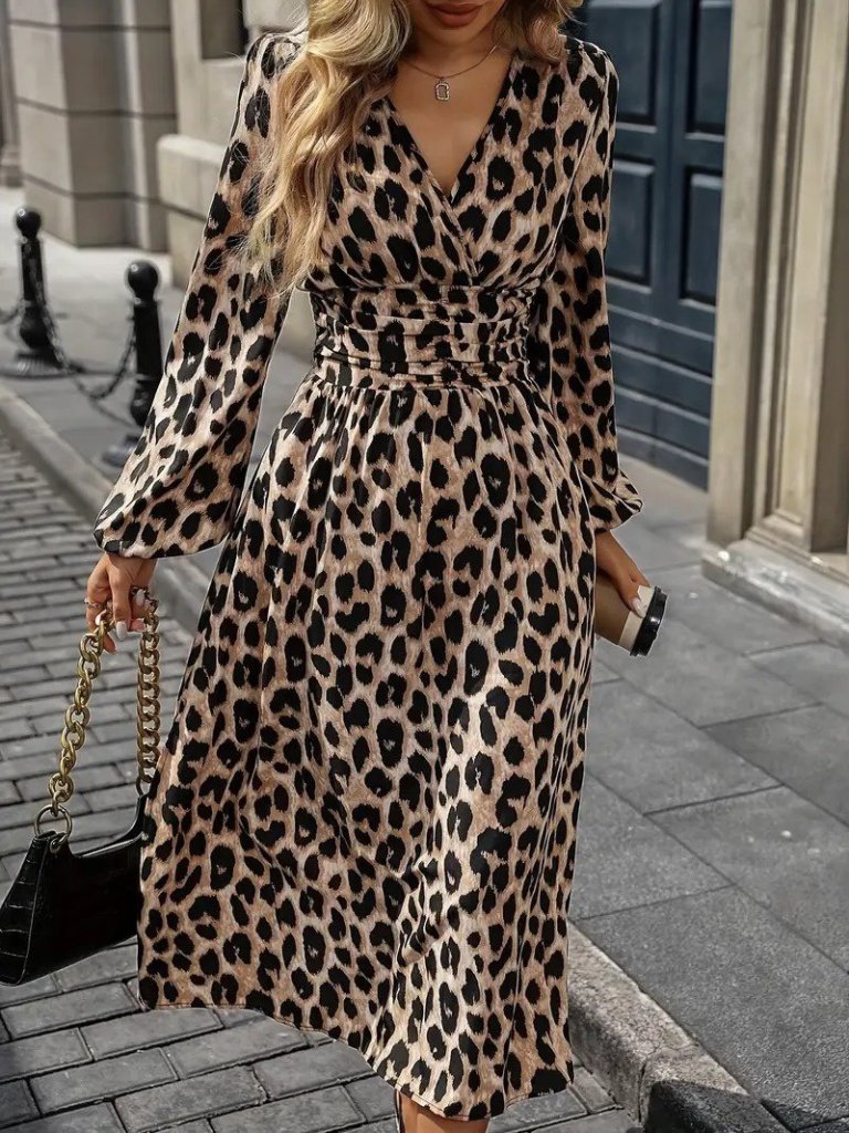 Desenli Kadın Zarif Duruş Uzun Kollu Kruvaze Yaka Belden Oturtmalı Midi Modal Leopar Elbise