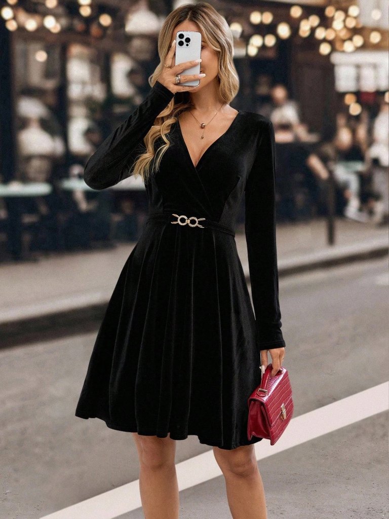 Kadife Kadın Zarif Duruş Uzun Kollu Kruvaze Yakalı Toka Detaylı Mini Elbise