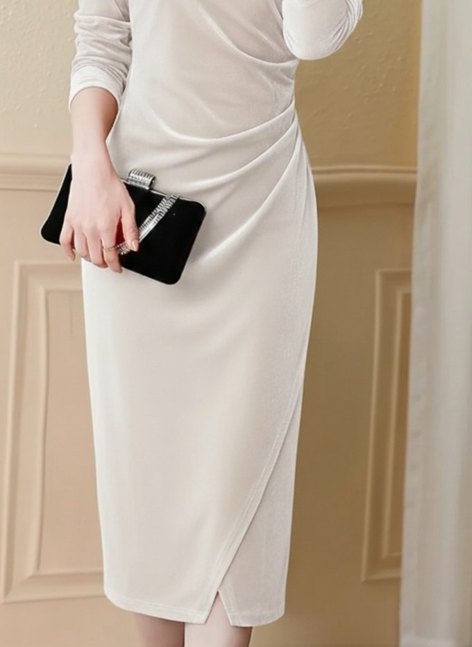 Kadife Kadın Zarif Duruş Uzun Kollu Kruvaze Yakalı Yandan Büzgülü önden çapraz Detaylı Midi Elbise