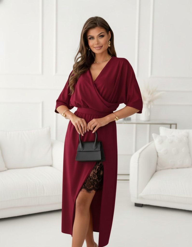 İthal Krep Kadın Zarif Duruş Uzun Kollu Kruvaze Yakalı Yandan Dantelli Midi Elbise