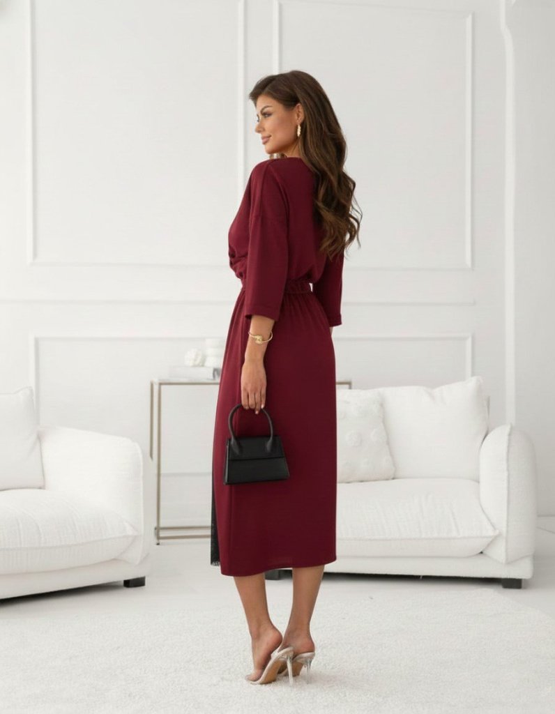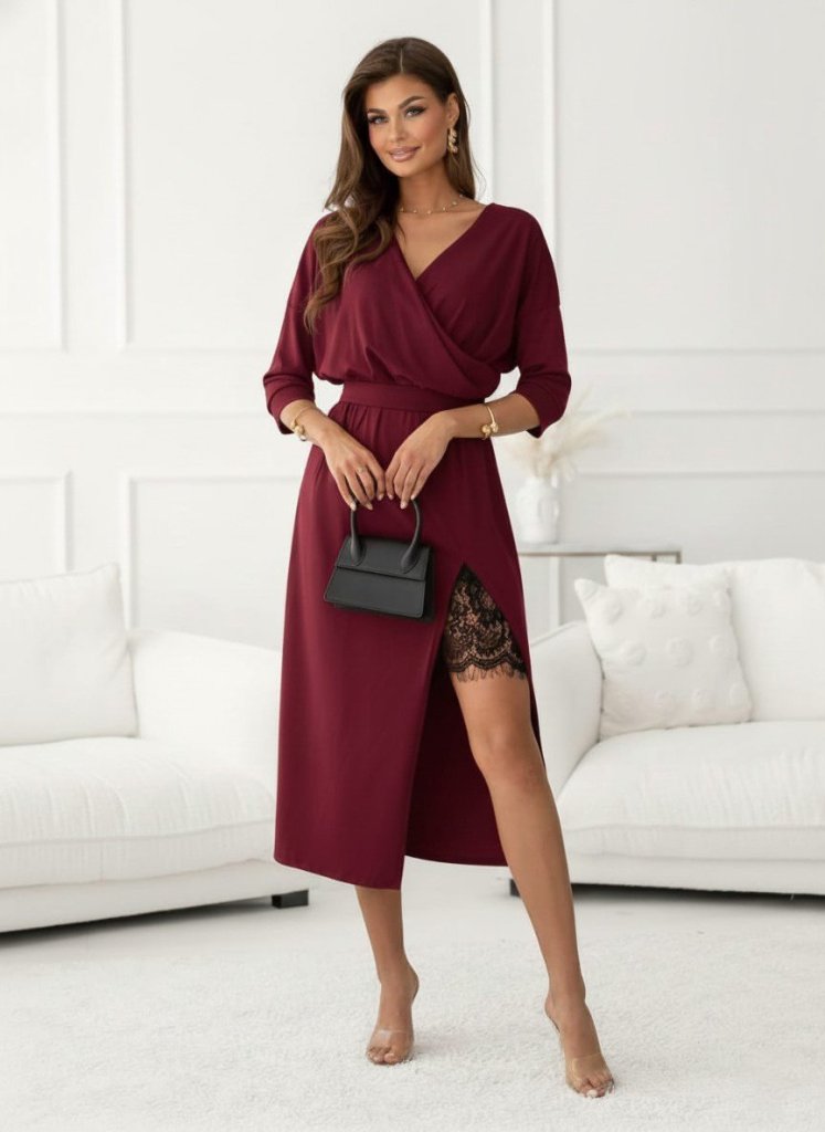 Kadın Uzun Kollu Kruvaze Yakalı Yandan Dantelli Midi Ithal Krep Elbise