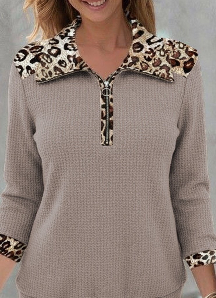 Waffle Kadın Zarif Dokunuş Uzun Kollu Leopar Yakalı Fermuarlı Bluz