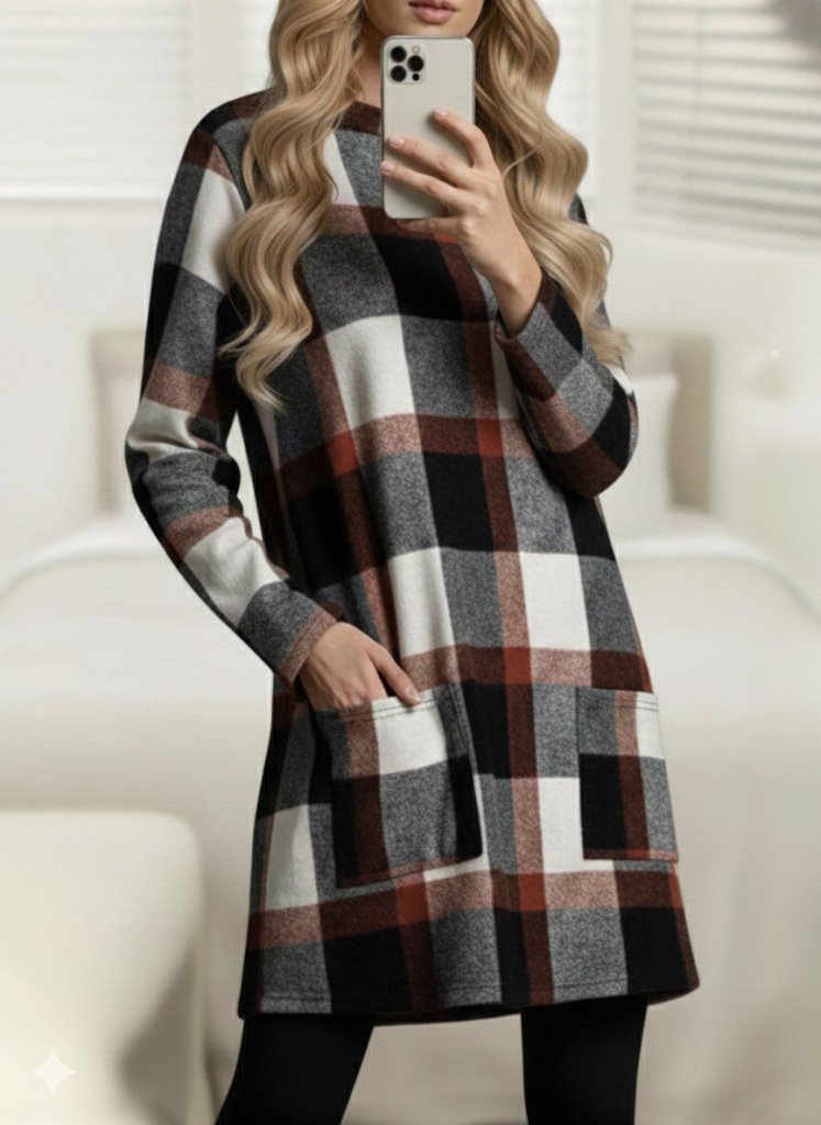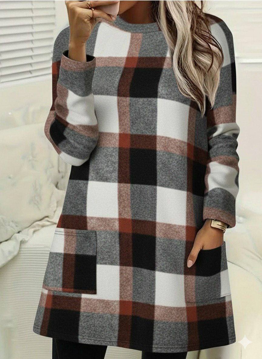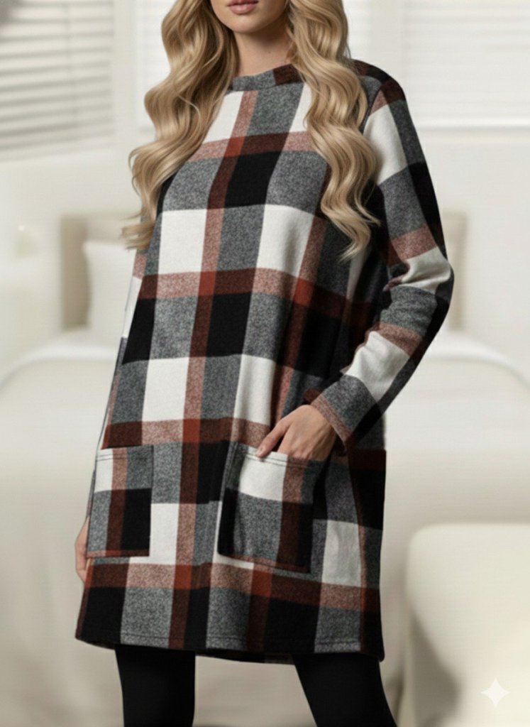 Kadın Modern Stil Uzun Kollu Yarı Balıkçı Yakalı Cep Detaylı Ekoseli Dokuma Tunik