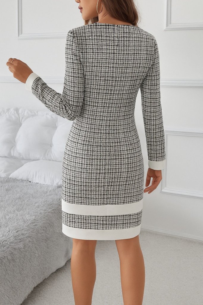 Kadın Zarif Duruş Uzun Kollu Yuvarlak Yaka Etek Ucu şerit Detaylı Mini Dokuma Elbise