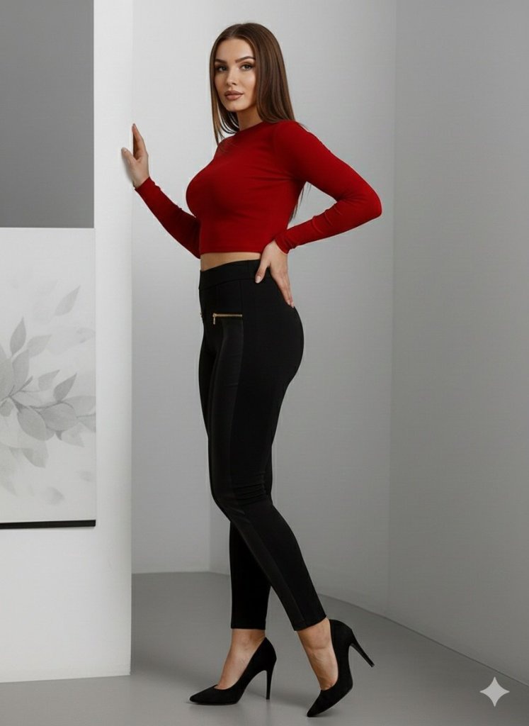 Kadın Yüksek Bel Deri Detaylı Fermuarlı Dalgıç Tayt