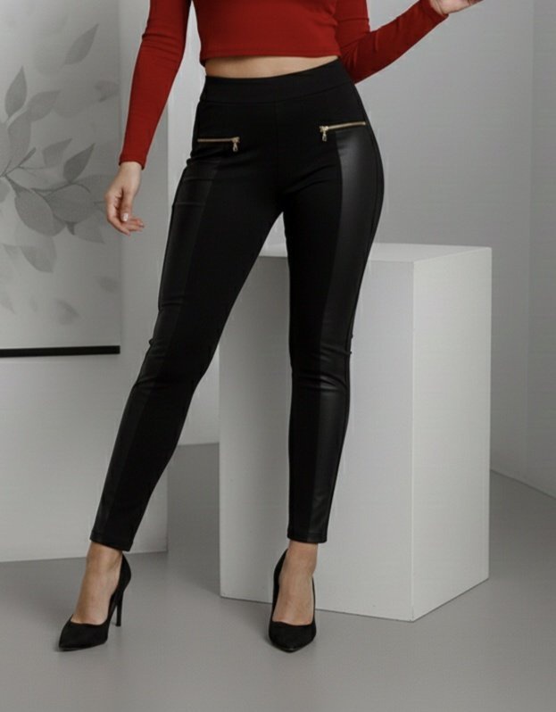 Dalgıç Kadın Rahat Kullanım Yüksek Bel Deri Detaylı Fermuarlı Tayt