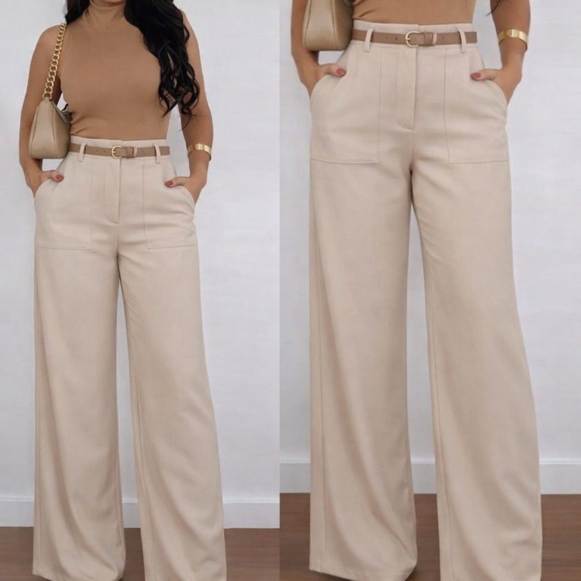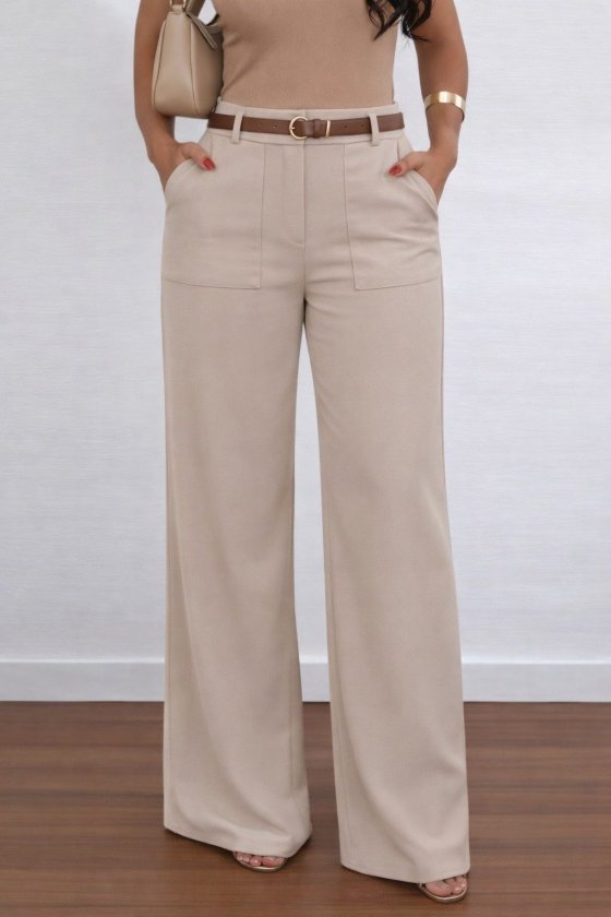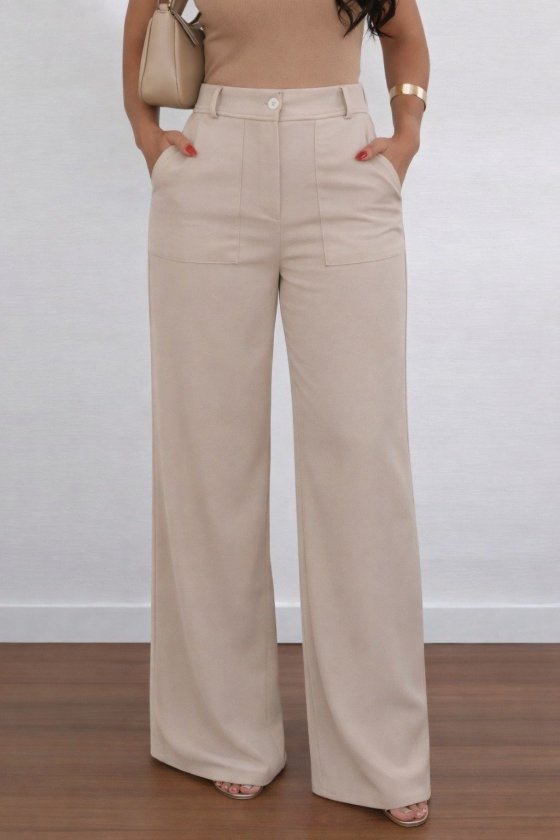 Kadın Yüksek Bel Geniş Paça Detaylı Cepli Ithal Krep Pantolon