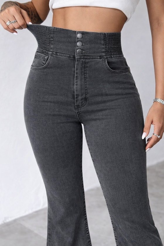 Kadın Yüksek Bel Yanları Lastik önü Düğmeli Kot Pantolon
