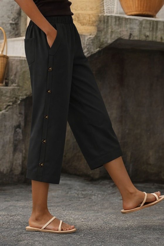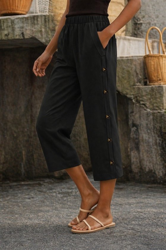 Kadın Yüksel Bel Lastikli Yandan Dügme Detaylı Midi Pantolon