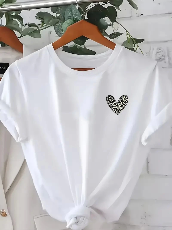 Baskılı Kadın Kadınlar Için Şık Leopar Kalp Günlük – Büyük Beden, Makinede Yıkanabilir, Sevgililer Günü – Günlük Kıyafetler Için Mükemmel- Beyaz Tişört