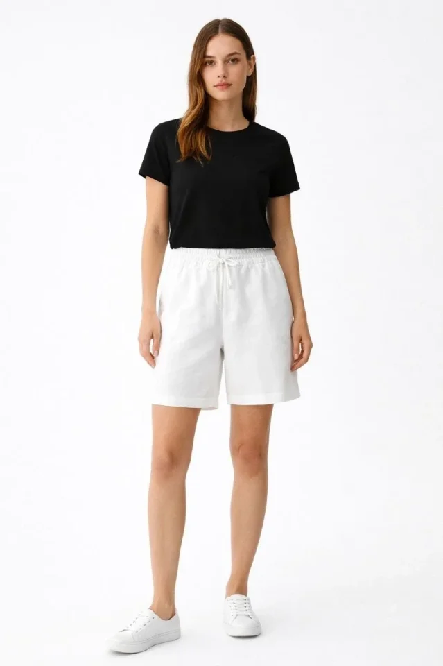 Keten Kumaş Cepli Rahat Kesim Bel Lastikli Şort – Beyaz