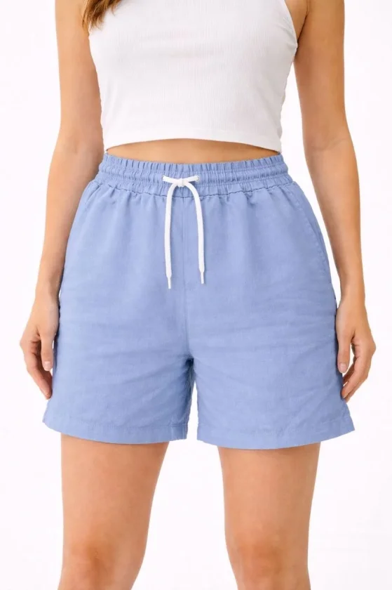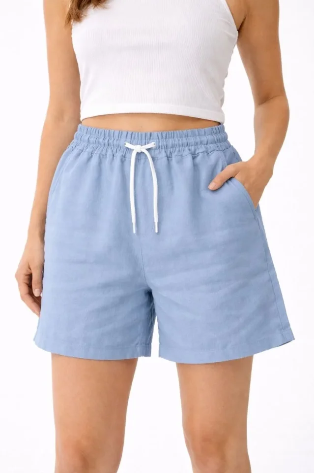 Keten Kumaş Cepli Rahat Kesim Bel Lastikli Şort – Mavi