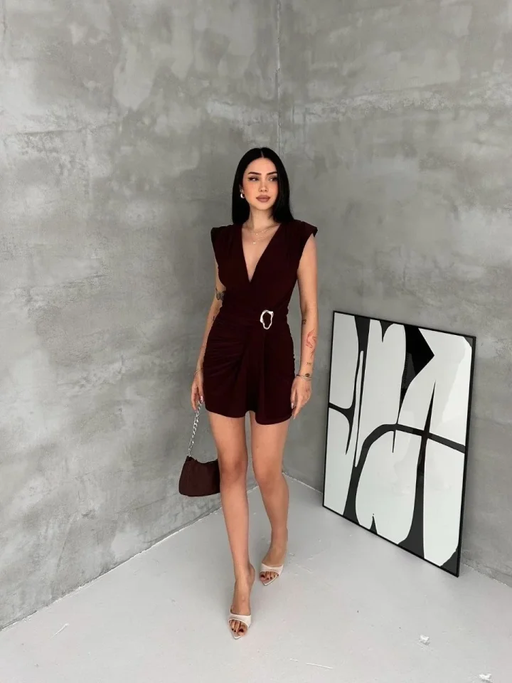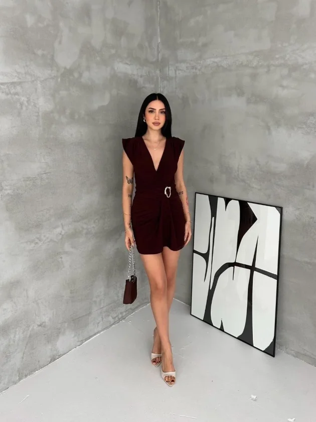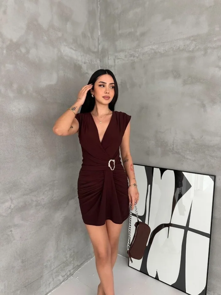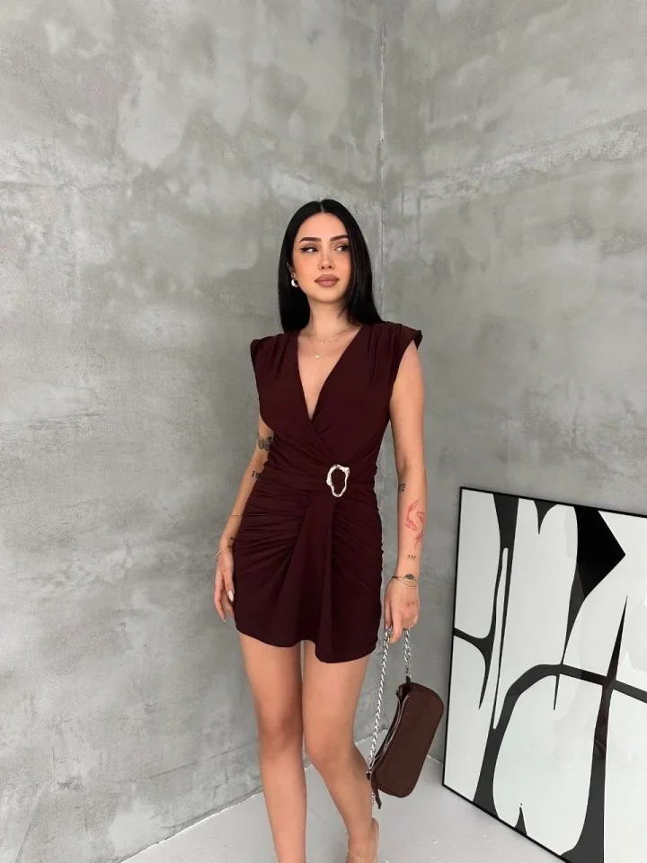 Kruvaze Drapeli Tokalı Mini Elbise Şık Gece Davet Abiye – Kahverengi