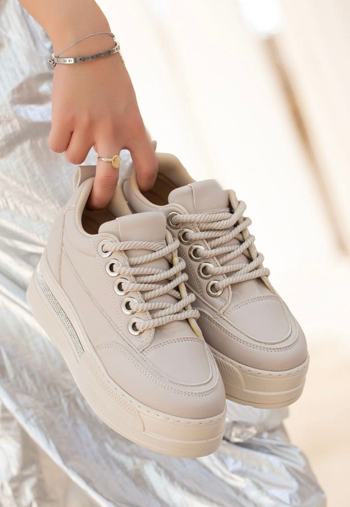 Lulu Bej Cilt Bağcıklı Spor Ayakkabı