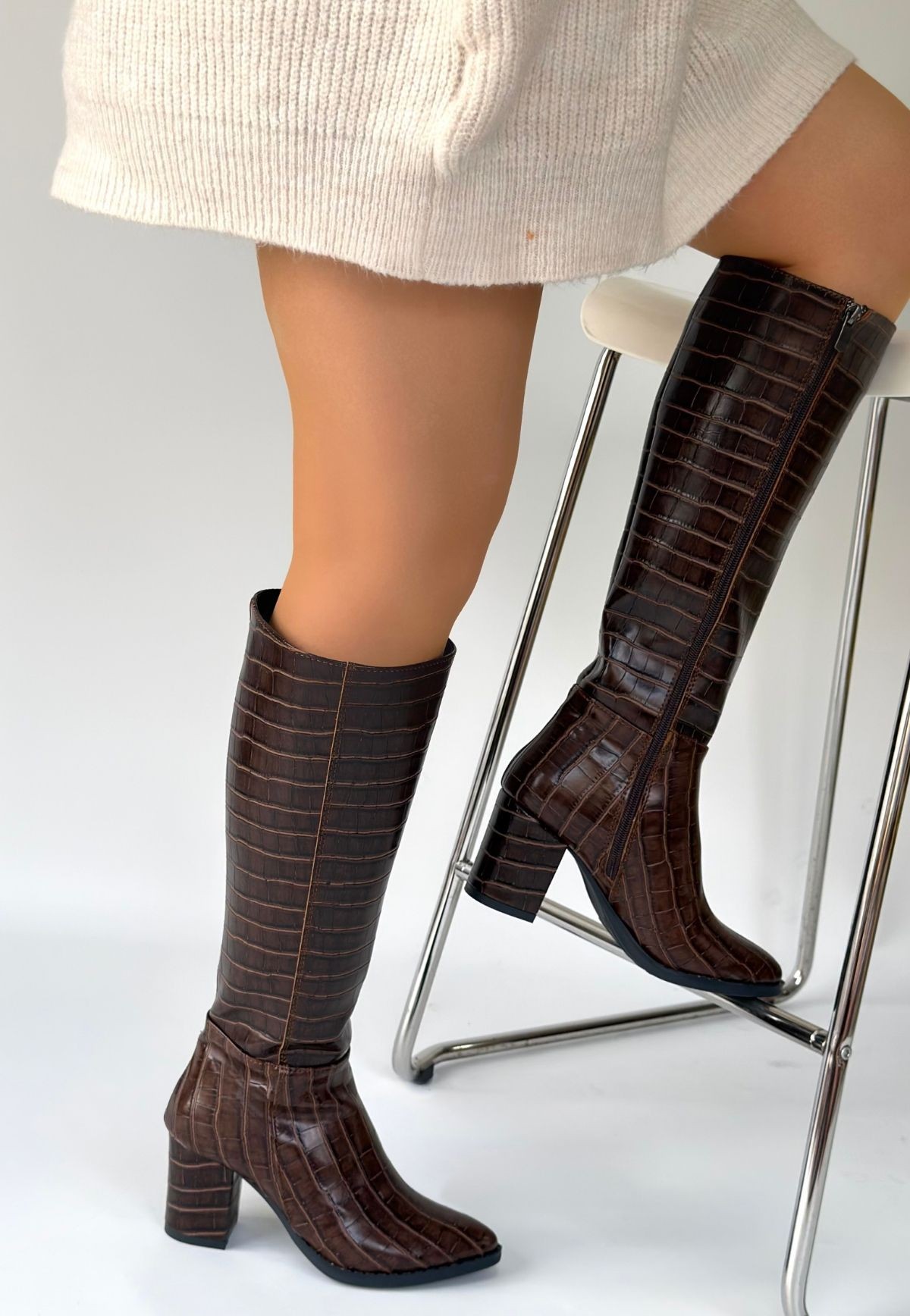 Desenli Kadın Modern Stil Morena Acı Kahve Rugan Topuklu Çizme