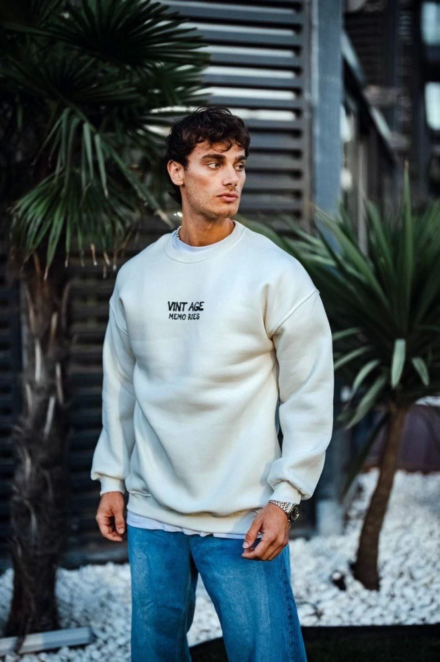 Oversize Bisiklet Yaka Üç İplik Baskılı SweatShirt – Beyaz