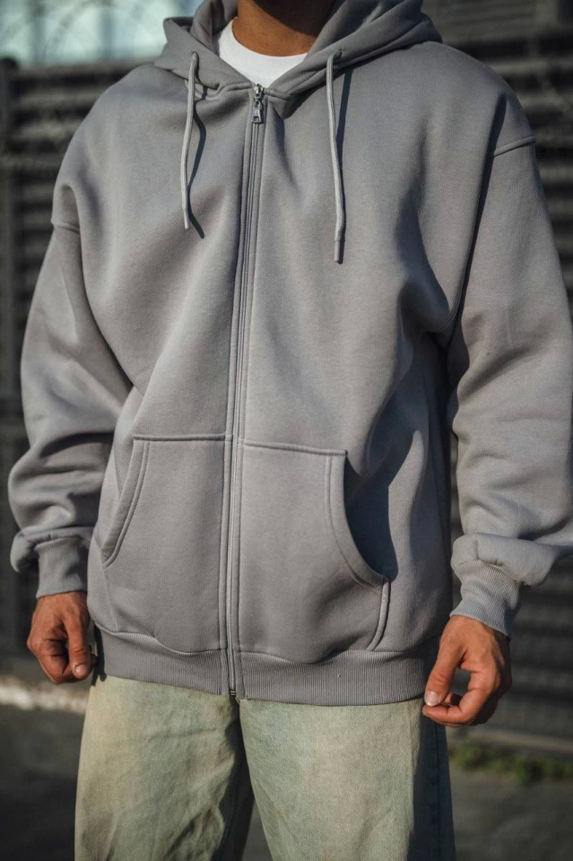Oversize Tam Fermuarlı Uzun Kol Hırka – Gri