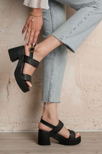 Wowi Siyah Cilt Baskılı Topuklu Sandalet