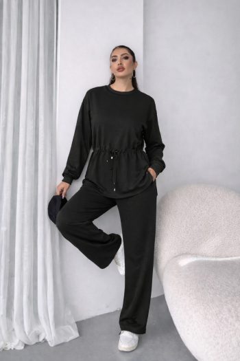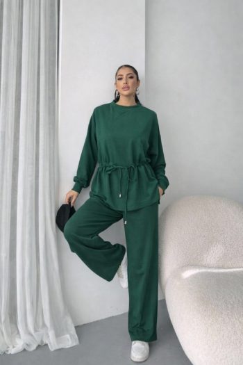 Viskon Kadın Zarif Dokunuş Uzun Kollu Bisiklet Yaka Belden Büzgülü Bağcıklı İki İplik Bluz Ve Pantolon İkili Takım