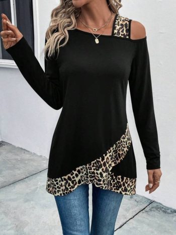 Viskon Kadın Zarif Dokunuş Tek O Uzdan Açık Askılı Uzun Kollu Leopar Detaylı Bluz